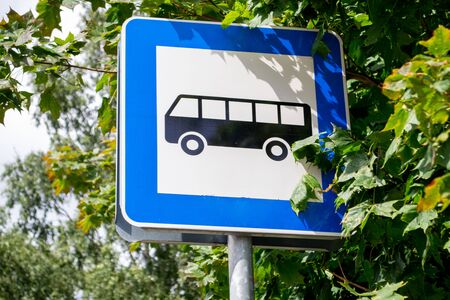 Bus stop sign in Reykjavik, Iceland. Modern public transport. Bus stop in the city street. Bus station. Traffic signs.
