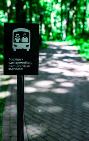 Red Hop On Hop Off Bus sign close-up on a tourist station.