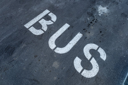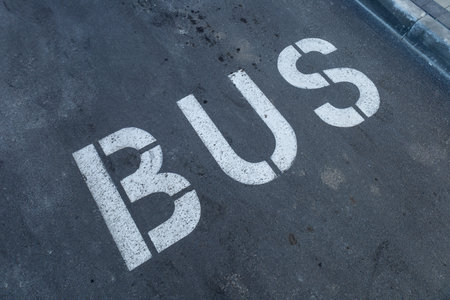 Large letters spelling out bus mark a designated parking area, emphasizing public transport availability at the location.