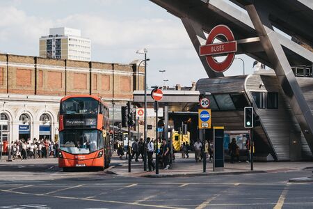 London, UK - July 16, 2019: Red double decker bus towards Marylebone leaving Vauxhall Bus Station, the second busiest bus station in London.