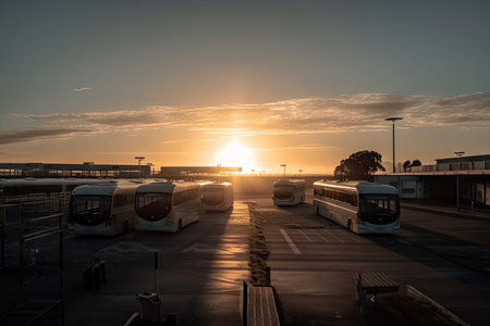 bus depot at sunrise, with the sun rising over the horizon, created with generative ai