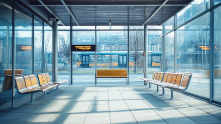 Modern bus station interior featuring sleek benches and large glass windows, providing an inviting space for travelers to wait and relax.