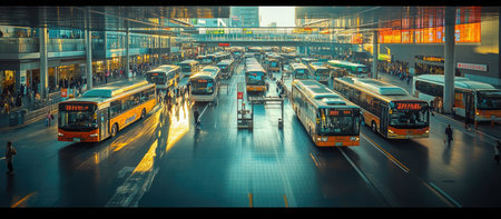 A well-organized public transport station with buses lined up and clear signage, emphasizing the efficiency of urban transit systems