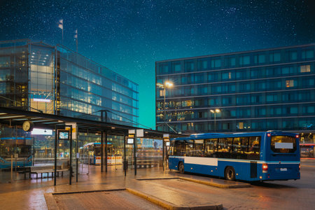 Helsinki, Finland. Bus Is At Stop On Helsinki Railway Square. Square Serves As Helsinki Secondary Bus Station And Main Kamppi Center Bus Station. Night stars shining above street