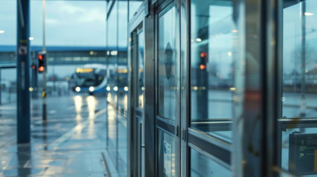 A shot of the departure gate doors closing with a bus driving away in the background