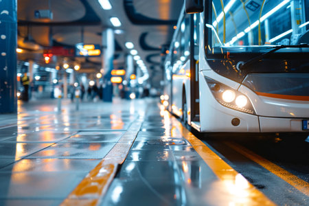 Modern bus waiting at a brightly lit station at night with reflections on the wet floor. Generative AI