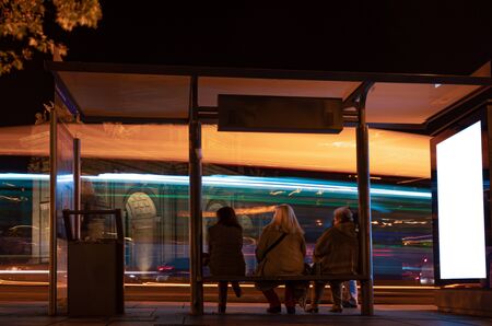 Group of anonimous people waiting the public transport in a night bus station with billboard. White blank screen