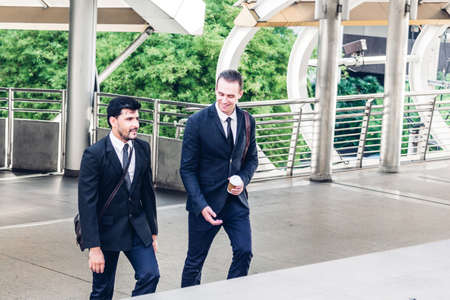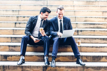 Two businessman coworkers in black suit talking and working with laptop.business people discussing strategy on the stair