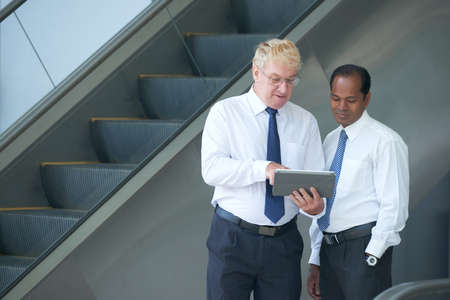 Serious mature businessman in formal suit pointing at digital tablet while explaining data to young Afro-American colleague