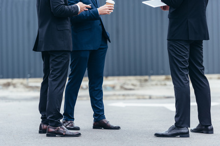 cropped shot of businessmen drinking coffee and working with digital tablet on street