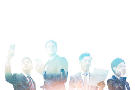 Portrait of professional business man and blur employee in background isolated on white, serious