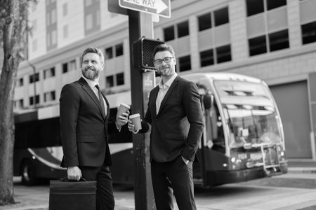 Businesspeople outdoor. Business colleague at coffee break. Businesspeople talking with coffee cup. Colleague have business meeting. Business of businesspeople. Coffee break. Business advertisement