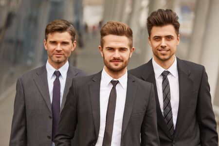 Generative AI : Group of three modern business men of different age and ethnicity looking seriously at camera Business life style concept with businessmen standing outside