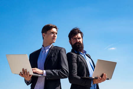 Businessmen in suit with laptop. Online working. Businessmen checking email. Business men freelancing outdoor. Business online. Men working on laptop. Businessmen working online. Freelance concept