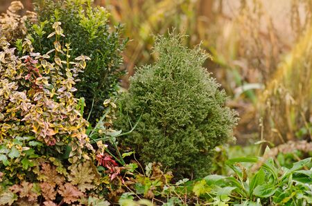 Beautiful spring garden design, with conifer trees, green grass and eneving sun