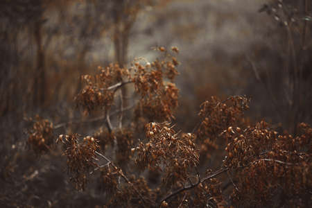 Bush with bare branches. Late autumn in the garden. Dry plant and yellow grass.