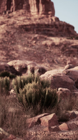 A close-up view of a sagebrush bush with its delicate leaves catching the warm sunlight in a dry, rocky terrain