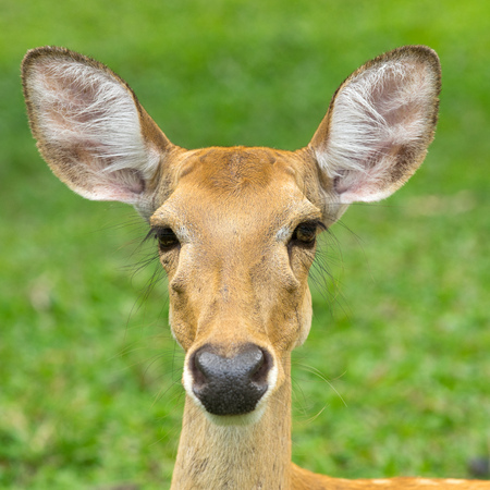 Close up a young dears's head on daytime natural light stare back to us.