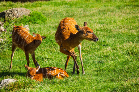 Three young antelopes grazing and resting on green grass in bright sunlight, surrounded by natural vegetation in a peaceful outdoor setting