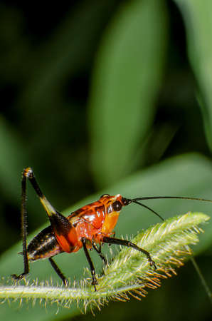 Macro of a colorful yellow red cricket