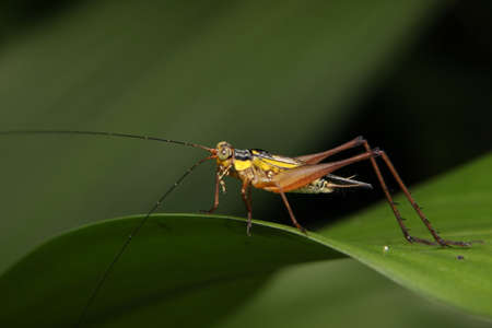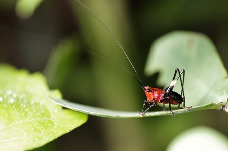 Cricket on a leaf in the rainforest of Thailand.