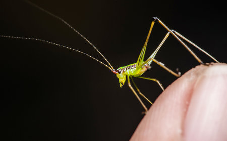 Macro close-up of a green cricket standing on human finger, showcasing its delicate features and the texture of the skin