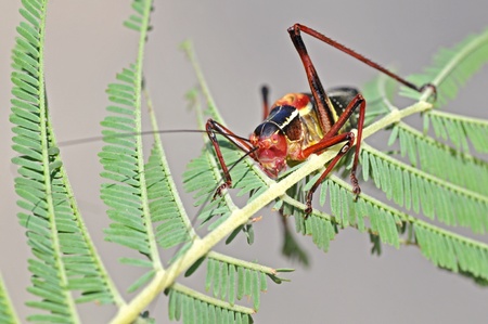 Red Grasshopper perching on a leaf