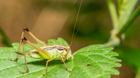 Macro close up grasshopper standing on a nettle leaf