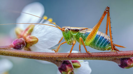 A stunning close-up image of a grasshopper on a blade of grass, revealing intricate textures and vivid colors, capturing the beauty of wildlife in a serene natural setting.