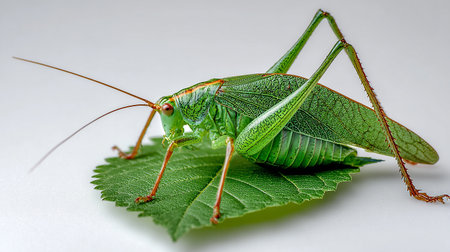 This macro image showcases a vibrant green grasshopper resting on a leaf, emphasizing its intricate details, texture, and sharp features in a natural environment.