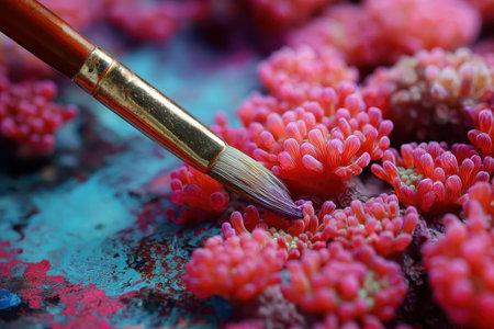 Bright coral reef paints being applied with a brush for an artistic underwater representation