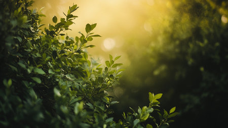 Green leaves on branches for banner concept. Beautiful bush in garden background