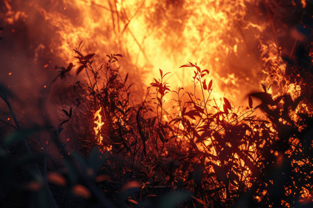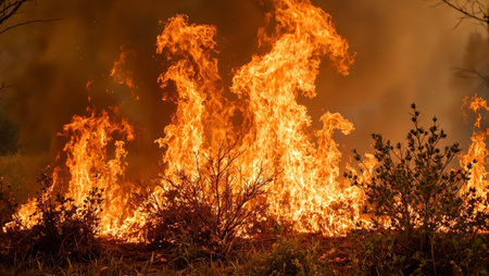 Intense flames consuming shrubs and trees with swirling smoke and ash