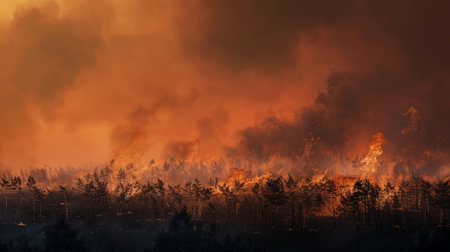 An intense wildfire rages through a forest landscape, with flames and smoke billowing in the air. The scene captures the urgency of nature's fury, emphasizing the destructive impact on the environment.