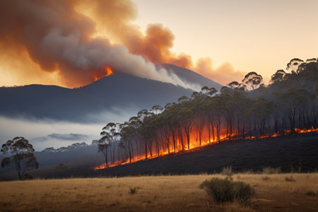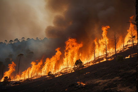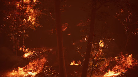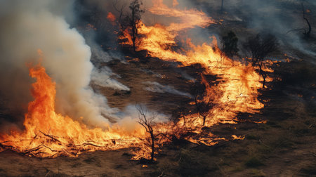 Captivating view of a wildfire with flames engulfing trees. Smoke fills the air, highlighting the destruction in nature's landscape. This dramatic scene showcases the intense heat and environmental effects of wildfires, emphasizing the urgency for conservation and prevention efforts.