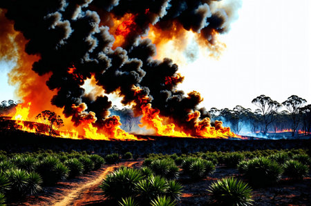 A powerful digital painting captures the fury of a wildfire, engulfing trees amidst high temperatures and dry conditions. It underscores the urgent need to address escalating climate change risks.