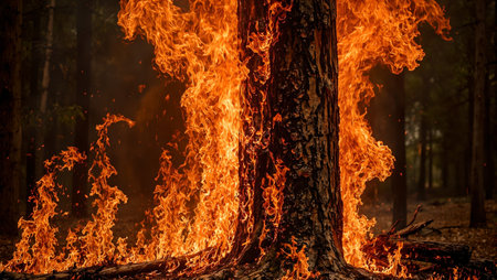 Intense forest fire engulfing a large tree flames spiral up trunk glowing surroundings