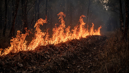 Dramatic wildfire in forest with glowing trees and falling ash