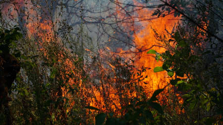 The raging flame of fire burn in the fields, forests and black thick acrid smoke.