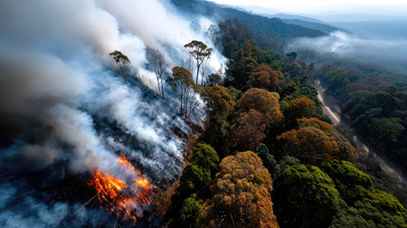 An aerial view presents a dramatic scene of a forest fire, with dense smoke swirling above lush greenery, capturing the urgent beauty and ecological impact of wildfire.