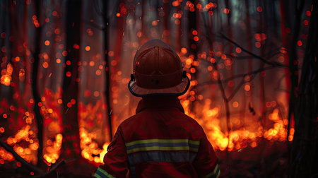 Experience the adventure! A young hero stands amidst a forest fire in his firefighter suit, surrounded by gloom and danger