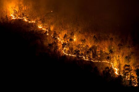 Forest fires, red and orange forest fires at night in the dry season
