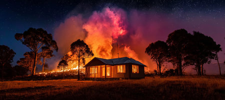 A Dramatic House Consumed by Wildfire Surrounded by Tall Trees Under a Starry Night Sky