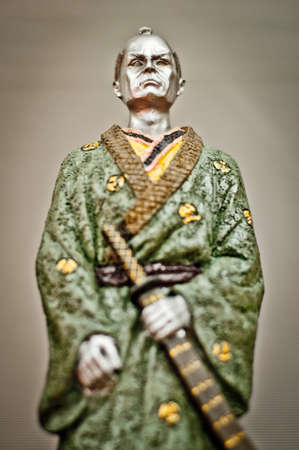 Samurai statue closeup. Ancient samurai statue with green kimono and katana sword.