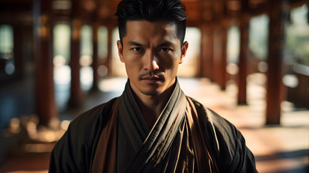 Portrait of handsome Asian man in traditional clothes in the temple