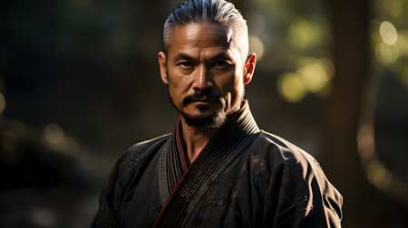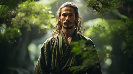 Serene elder in traditional attire holding a katana, poised amidst tranquil woods