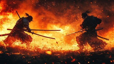 Two samurai swords clash in a fiery duel, their blades crossing in a dramatic display of skill and determination. Sparks fly as the intense battle unfolds, with a fiery glow illuminating the scene.