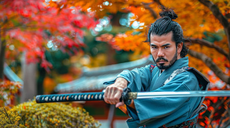 Focused Samurai Warrior With Katana Sword In Hand Posing In Front Of Vibrant Autumn Colors