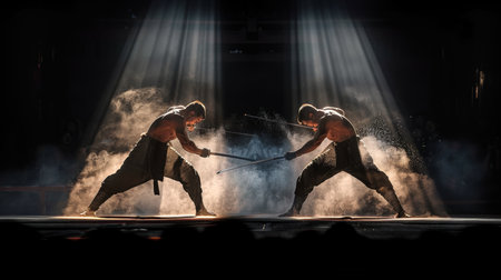 Two Martial Artists Engage in a Dramatic Sword Fight Under Stage Lights, Creating a Cloud of Dust