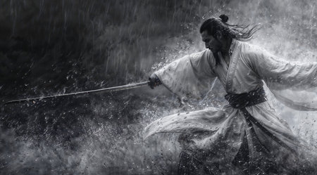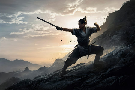 An AI illustration of an Asian gentleman wielding a traditional sword, showcasing his mastery.